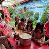 Piring yang sudah terisi lalu diletakkan menumpuk pada sebuah besi yang bentuknya hampir mirip rantang. Setidaknya ada lima piring tertumpuk, siap dibawa oleh relawan untuk ditata di meja yang sudah disiapkan.